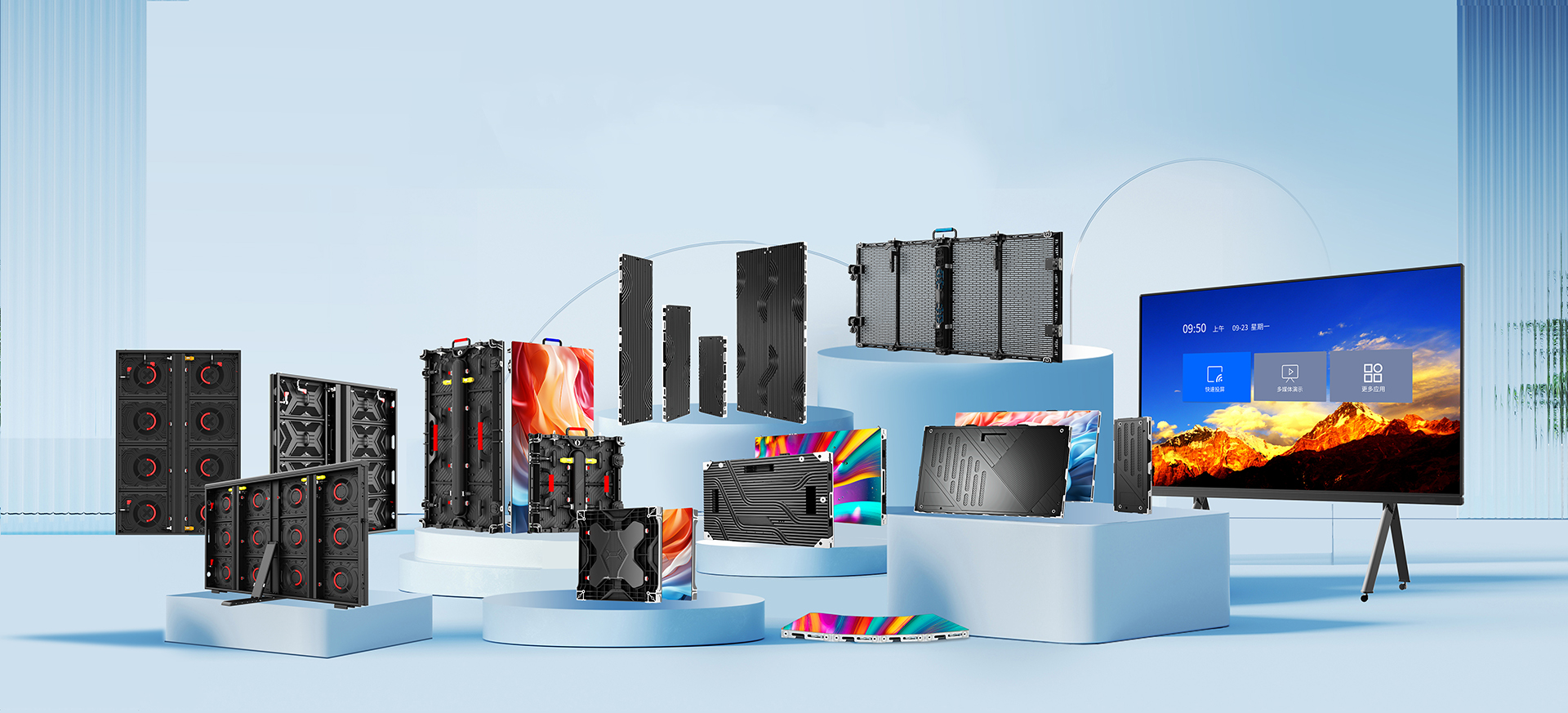 Main products include rental led display | XR stage studio virtual production led screen | Indoor HD led video walls | Fine pitch indoor displays| Outdoor commercial led billboard |Transparent led curtain display screens | Full HD digital led poster display banner | Full HD outdoor taxi top led sign displays| Car rear window digital led signage | Motorcycle cube delivery boxes led displays | Creative & Customized led display screens with Soft led module, Letter led display screen, Sphere led screens and Shaped led displays | etc.,