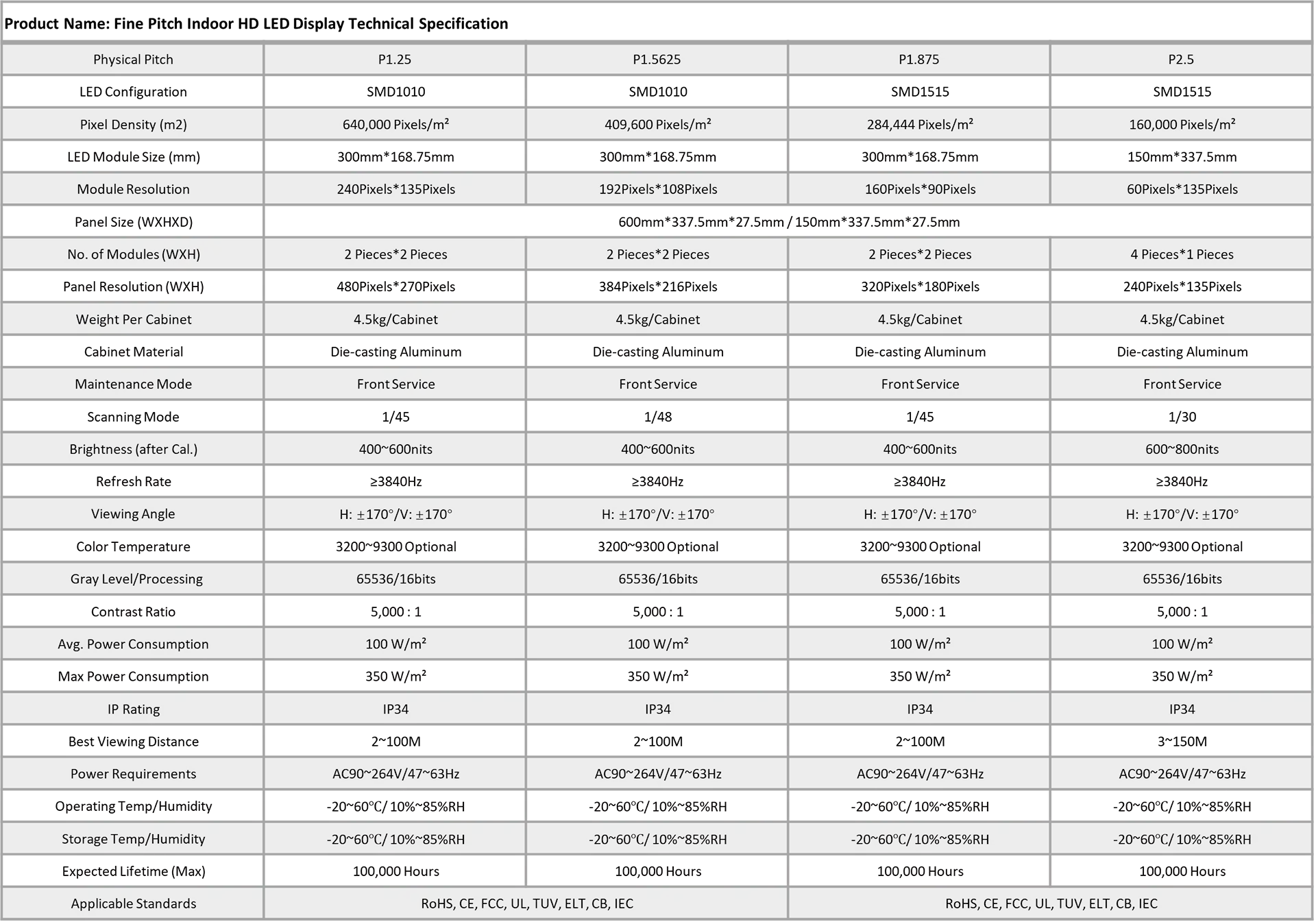The following introduces the differences in display pixel pitch, display size, resolution, brightness, power consumption, as well as operation and storage information. When placing an order, the final data sheets will depend on the material configuration and usage requirements.