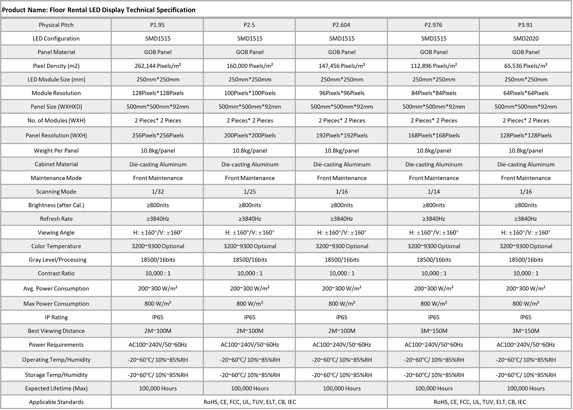 01. Pixel pitch models: 1.95 mm, 2.5 mm, 2.604 mm, 2.976 mm, 3.91 mm;