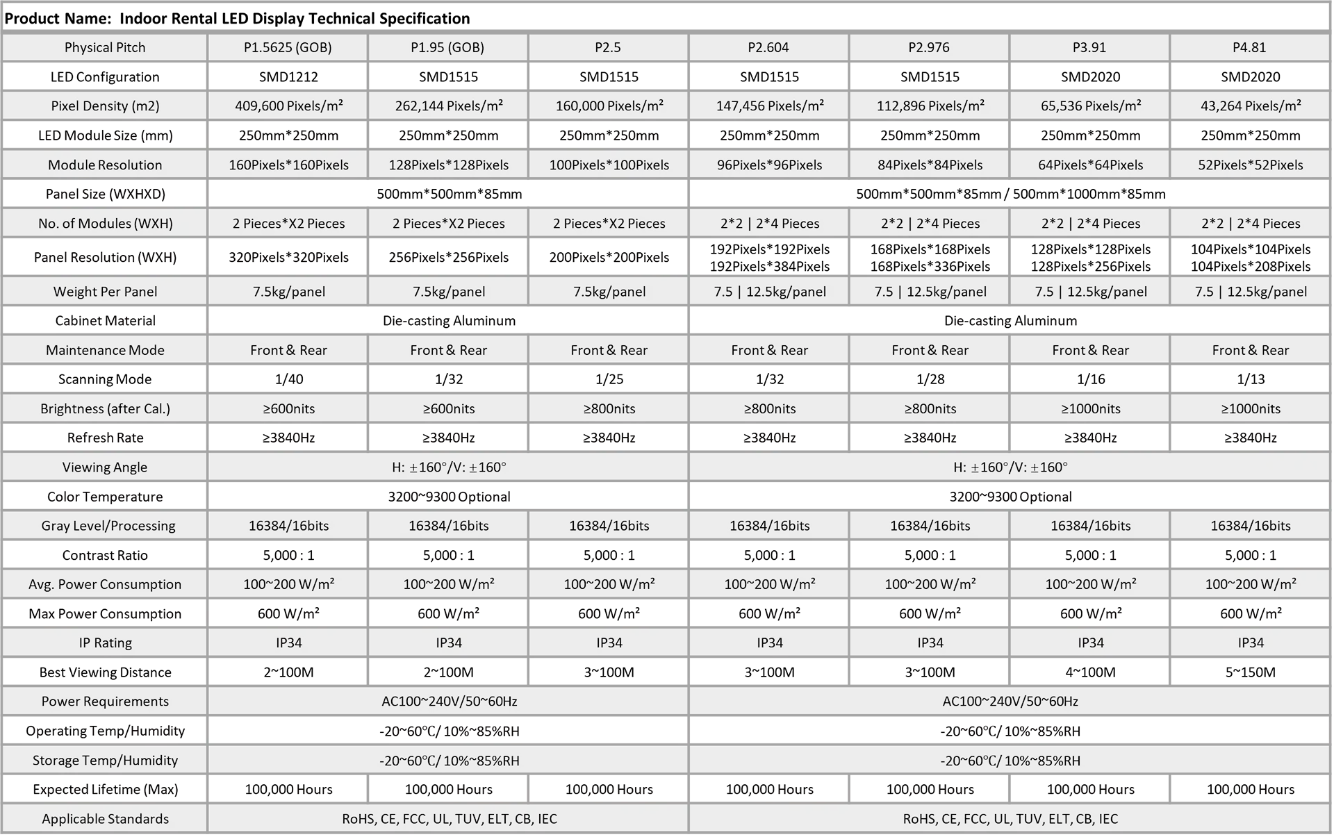 1. Pixel pitch models: 1.95 mm, 2.315 mm, and 2.604 mm;