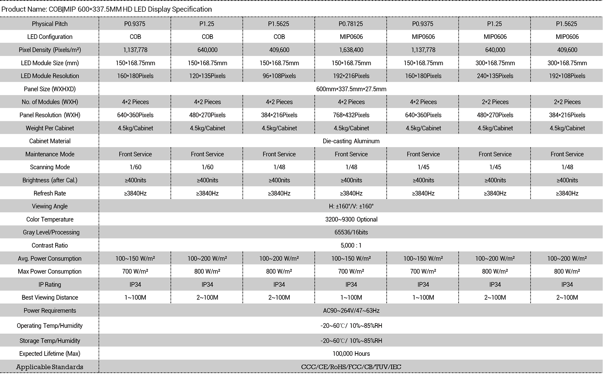 The latest models of MIP LED display products, including P0.78125, P0.9375, P1.25, and P1.5625, utilize a 16:9 ratio LED cabinet size of 600mmx337.5mm made from die-casting aluminum material.