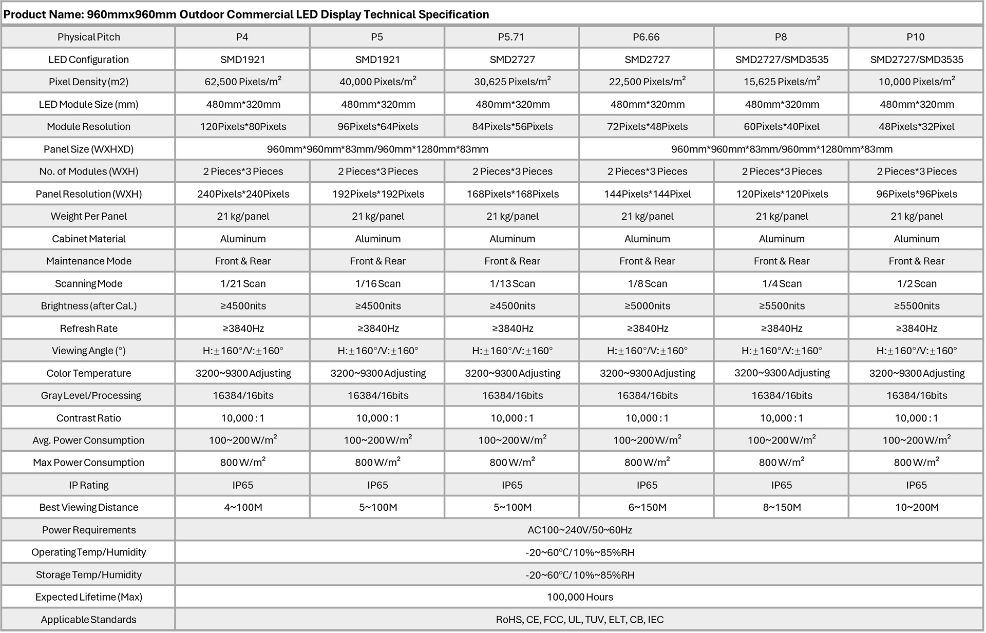 Pixel pitches of 4 mm, 5 mm, 5.71 mm, 6.66 mm, 8 mm, and 10 mm, with module sizes of 960 mm × 960