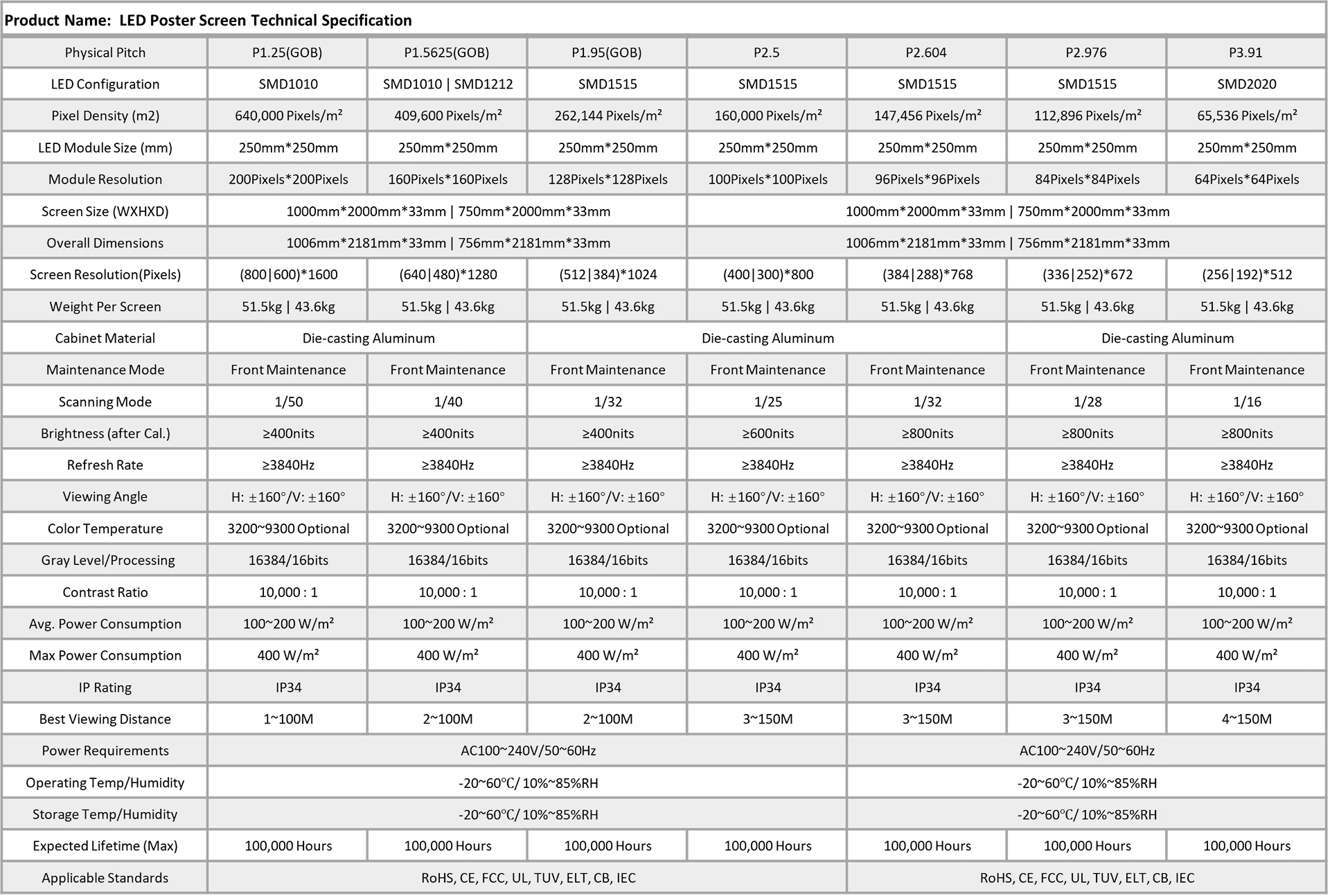 1. Pixel Pitch: 1.25mm, P1.5625mm, P1.95mm, P2.5mm, P2.604mm, P2.976mm, P3.91mm;