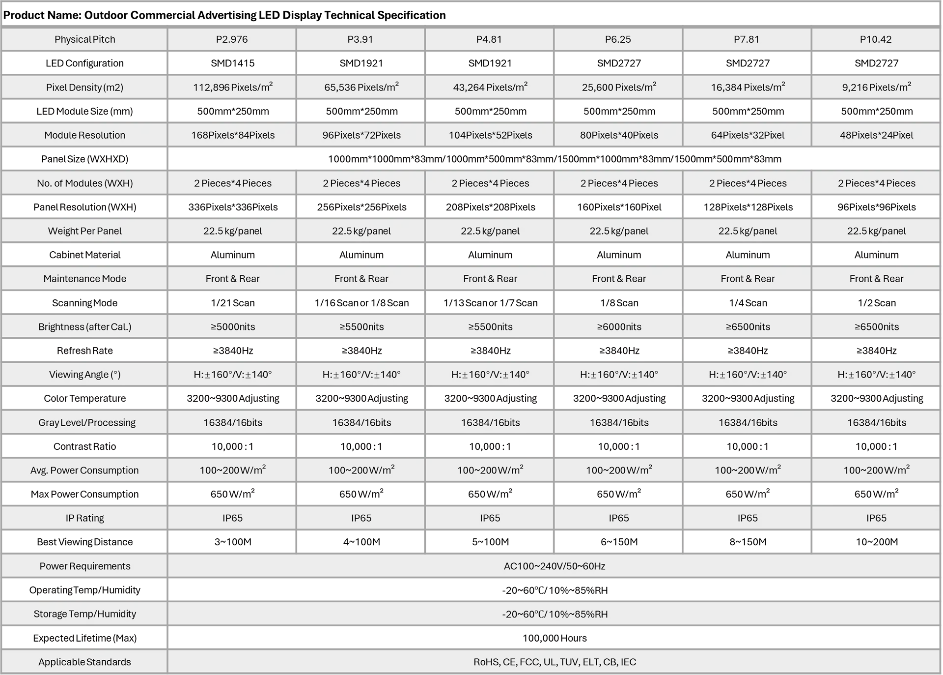 A. Pixel Pitch (Outdoor): 2.976 mm, 3.91 mm, 4.81 mm, 6.25 mm, 7.81 mm, 10.42 mm;