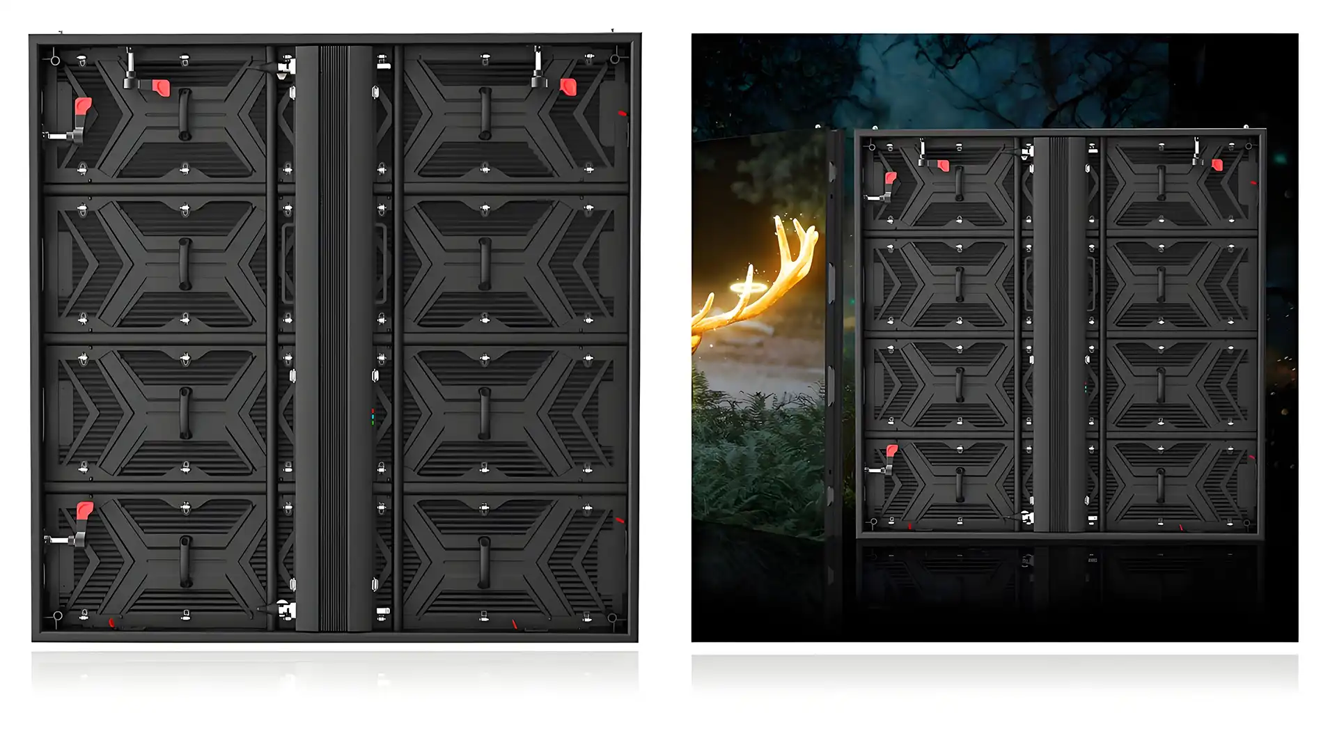 (2). Seamless Splicing: Beveled-edge LED modules, typically designed with 45-degree angles, enable gap-free integration between the two display surfaces, ensuring a continuous and cohesive visual experience;